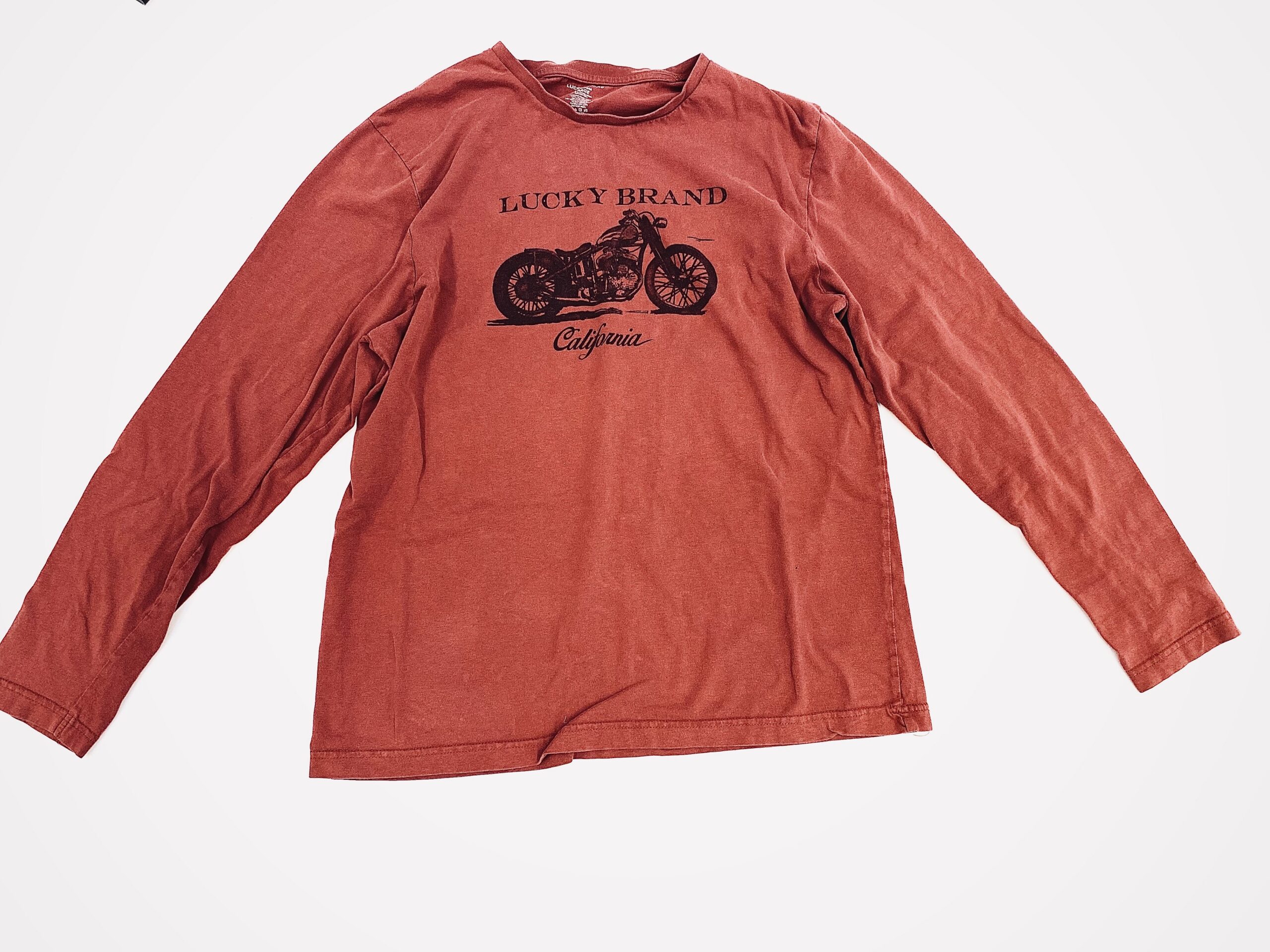 Tumepunane särk koos musta kirjaga “Lucky Brand California” ja on kujutatud ka musta mootorratast.